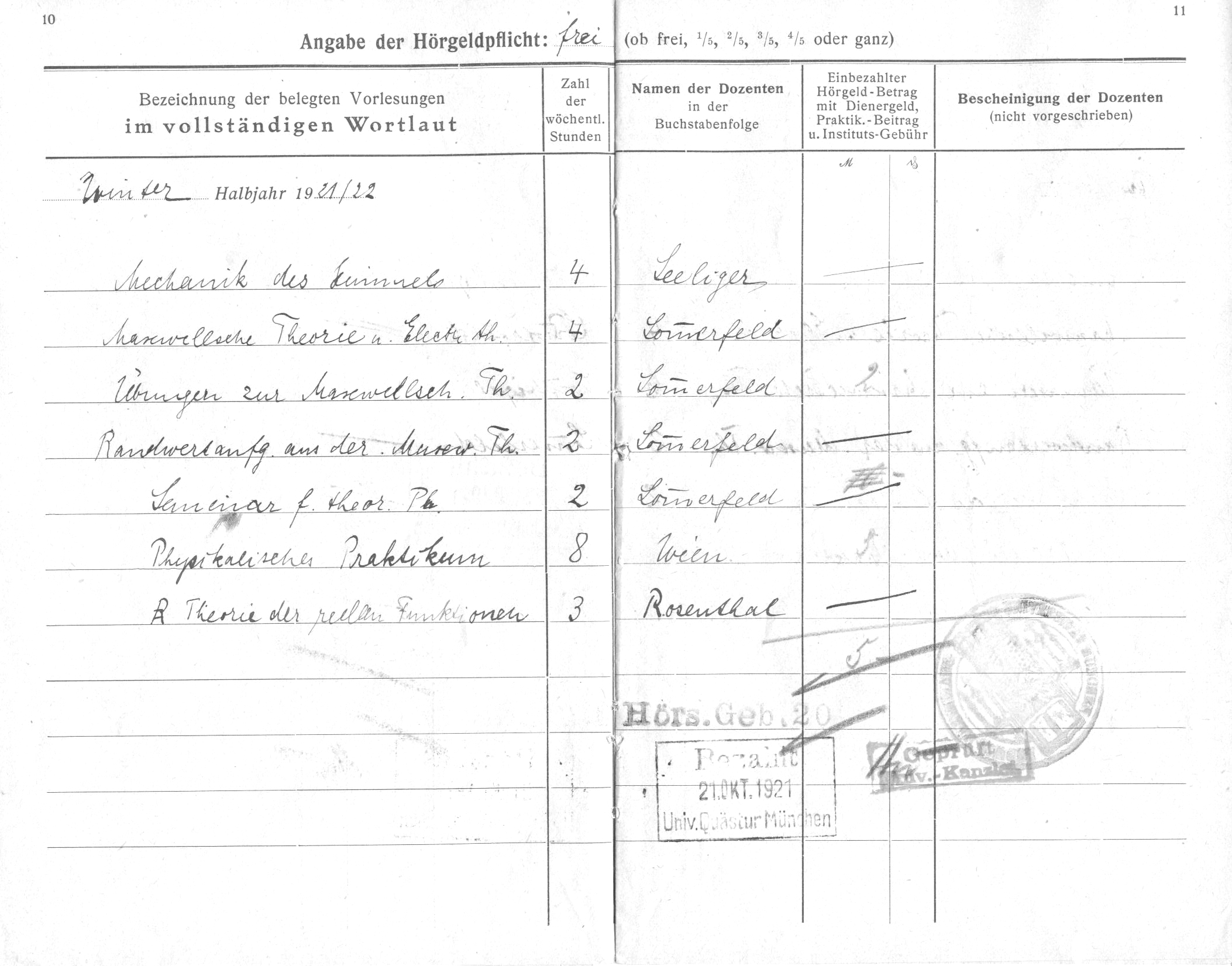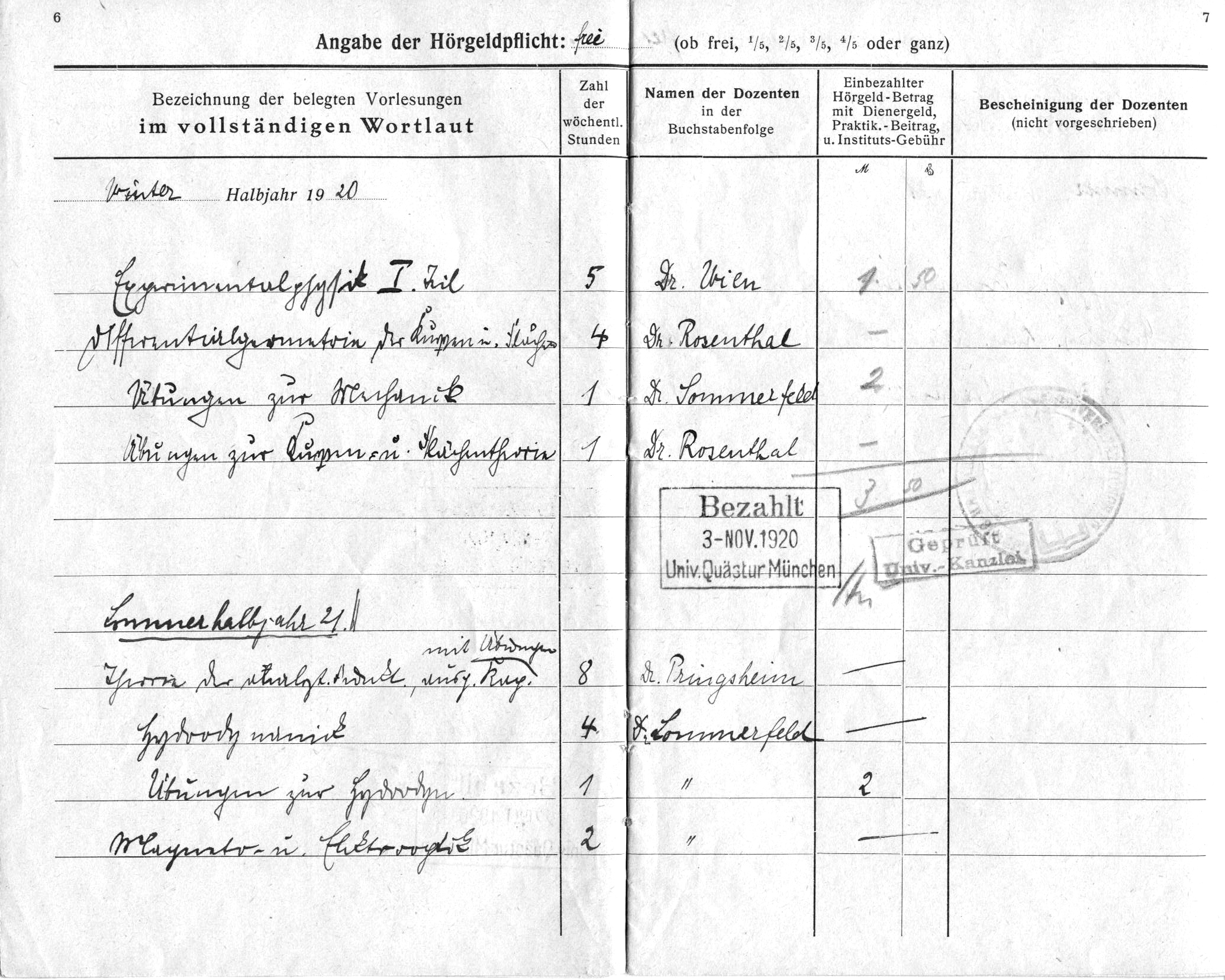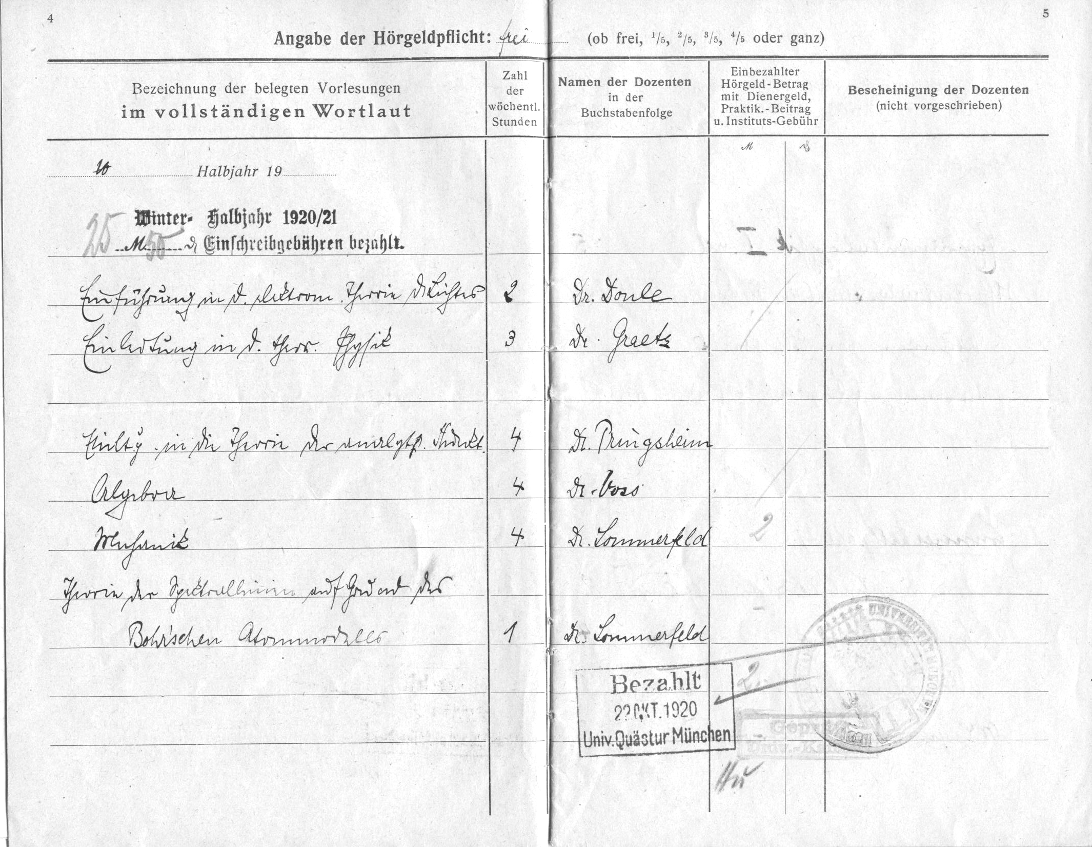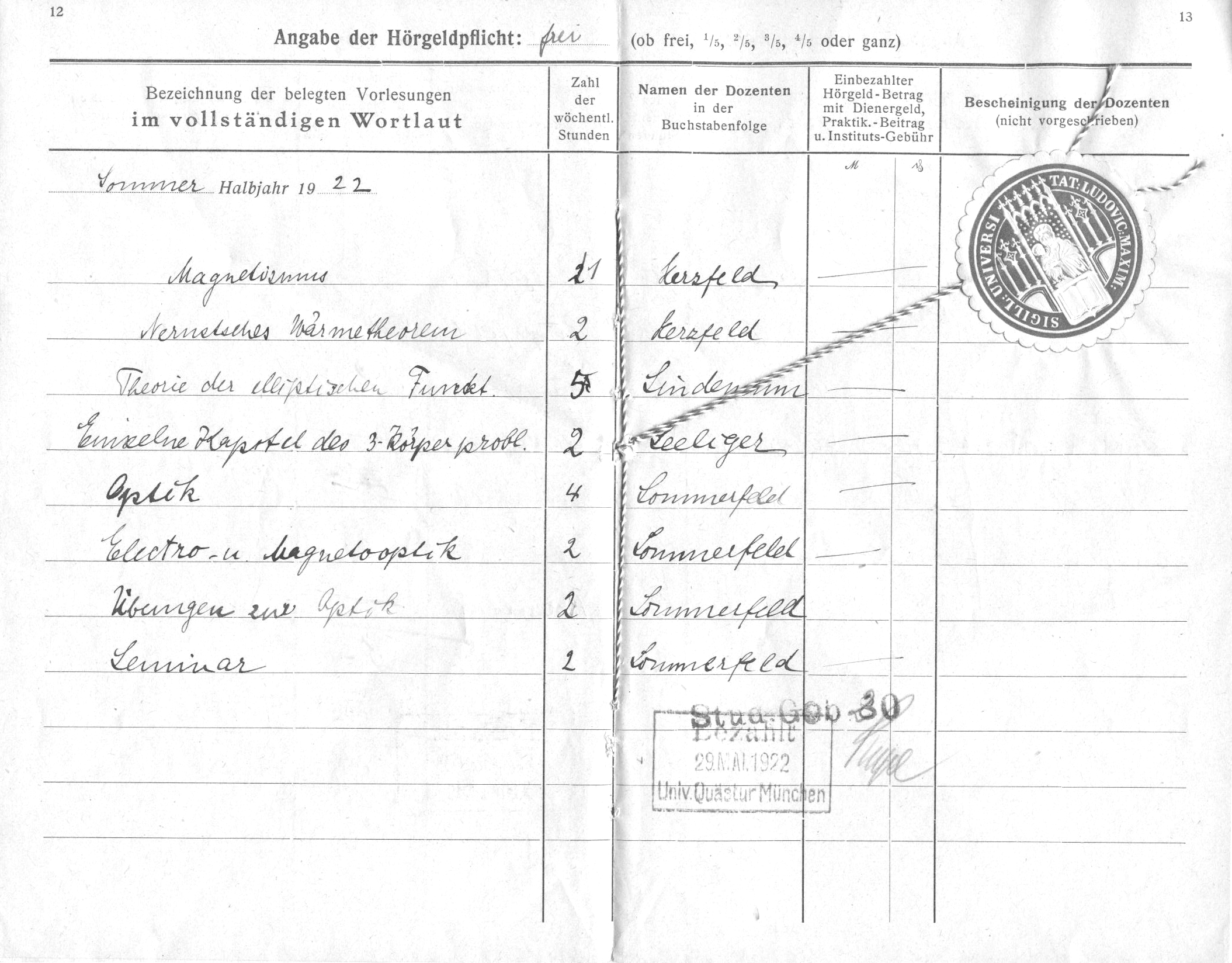 "Theor. physics seminar" (Sommerfeld); "Physics lab" (Wien); "Theory of real functions"